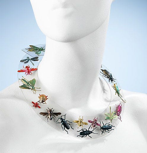 Schiaparelli made garments for smart, funny, self-aware women. She was so ahead of or outside her time as to be all but forgotten. Through her ideas, beauty and skill Schiaparelli fell in with the surrealists, who recognized her as one of their own. We can thank her for any number of things including the trompe l’oeil sweater and lurex. The Schiaparelli woman was an athlete, aviatrix, artist, or Wallis Simpson (cool and dangerous, in other words). This article makes you love her. I need that acrylic bug necklace. I might learn to pour acrylic, in fact.